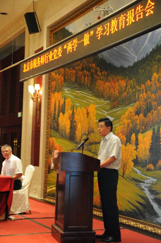 北京市注冊稅務師行業黨委為進一步增強“兩學一做”學習教育工作力度,使基層黨組織在全面推進營改增提供優質服務中起到排頭兵的作用,使廣大黨員為稅務師行業的改革發展建功立業,再創佳績, 6月29日下午,在新疆大廈會議廳組織了一次“兩學一做”學習教育專題報告會。