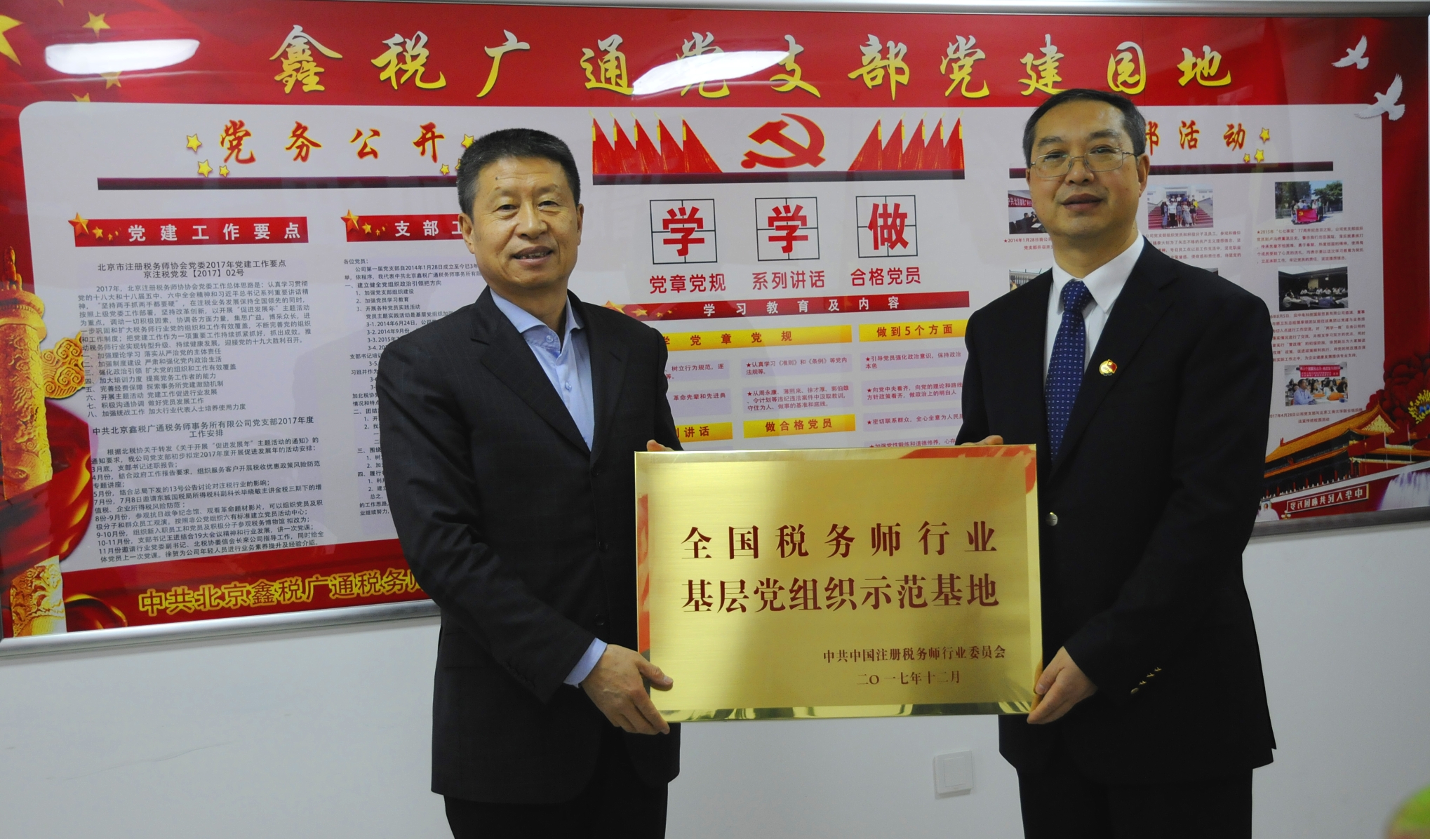 122日,全國稅務師行業基層黨組織示范基地首次授牌儀式在北京鑫稅廣通稅務師事務所黨支部舉行。中國注冊稅務師行業黨委常務副書記、中國注冊稅務師協會副會長兼秘書長李林軍,北京市國稅局巡視員、北京市注冊稅務師行業黨委書記張占英,北京市注冊稅務師行業黨委常務副書記、北京市注冊稅務師協會會長姜信,北京市注冊稅務師協會副會長、北京鑫稅廣通稅務師事務所黨支部書記王進,以及行業黨委辦公室負責同志參加授牌儀式。