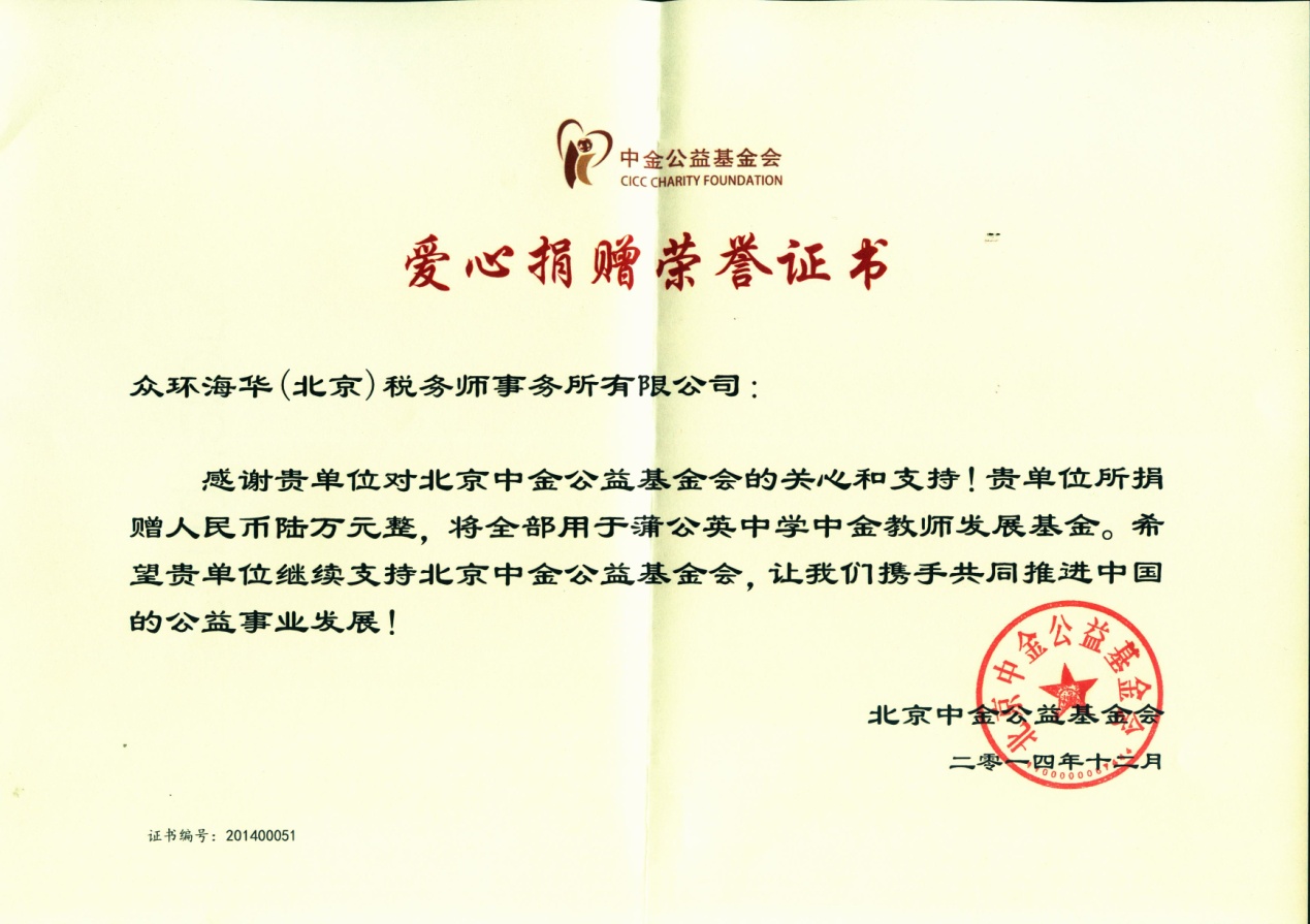 為了體現(xiàn)AAAAA級稅務師事務所的社會價值,更好地服務公益事業(yè),眾環(huán)海華自2013年與中國國際金融有限公司創(chuàng)辦的中金公益基金會開展公益合作,以自身的實際行動致力公益事業(yè),充分履行社會責任。2014年12月,眾環(huán)海華將為中金基金會提供常年財稅服務的全部收入人民幣6萬元悉數(shù)捐贈,所捐善款全部用于蒲公英中學中金教師發(fā)展基金項目。