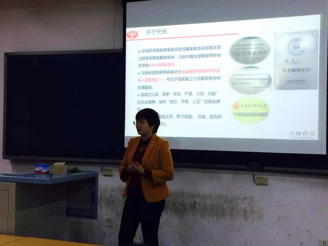 3月7日上午,天揚財稅服務集團總經理,天揚君和稅務師事務所創始人趙麗女士來到首都經貿大學,為研究生講授了一節生動的稅收相關知識的專題講座。