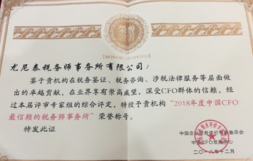 2018年12月21日,經中國企業財務評價專家委員會和中國CFO發展中心評審并公示,尤尼泰稅務師事務所有限公司被評為“2018年度中國CFO最信賴的稅務師事務所”,并予以通報表彰。