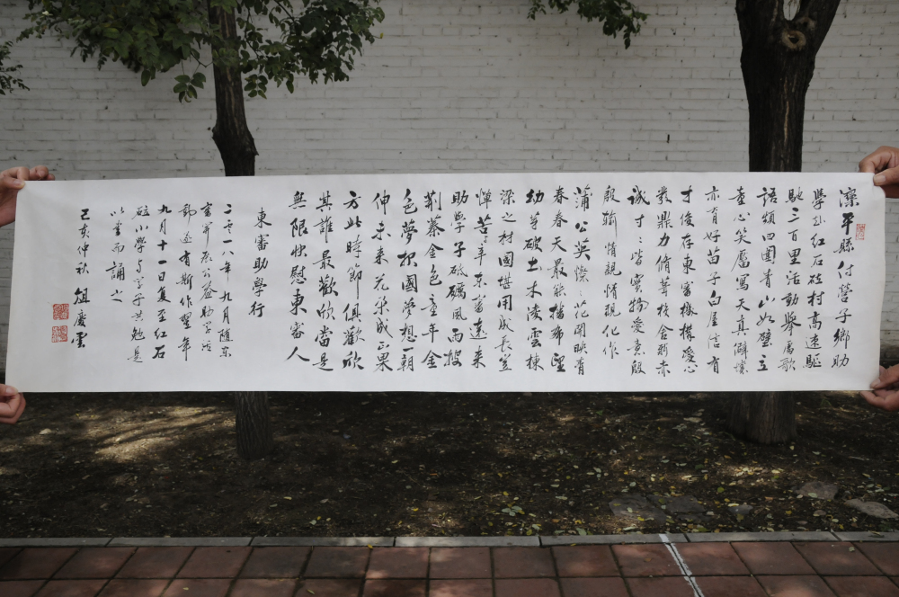 一位多次參加東審愛心捐助活動的人士非常感慨,特地書寫并當場朗誦了一篇《東審助學行》詩作:灤平縣付營子鄉,助學赴紅石砬村。高速驅馳四百里,活動舉處歌語頻。四圍青山如壁立,童心笑靨寫天真。僻壤亦育好苗子,白屋信有才俊存。東審機構愛心發,鼎力修葺校舍新。赤誠寸寸皆實物,愛意殷殷輸情親。情親化作蒲公英,燦燦花開映青春。春天最能播希望,幼芽破土木凌云。棟梁之材國堪用,成長豈可憚苦辛?東審遠來助學子,砥礪風雨披荊蓁。金色童年金色夢,報國夢想一朝伸。未來花朵成正果,方此時節俱歡欣。其誰俱歡欣?當是無限快慰東審人!