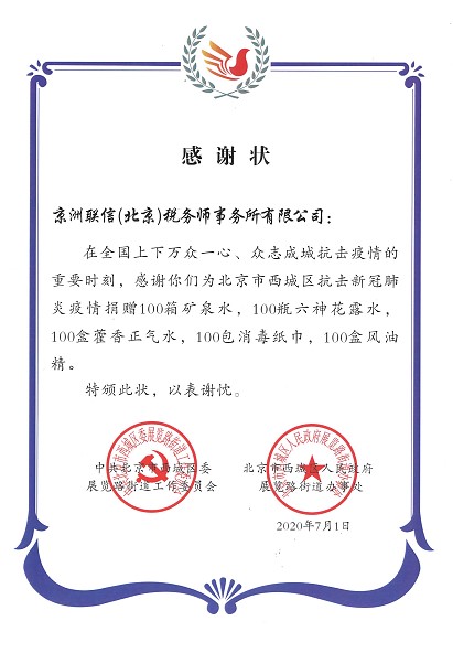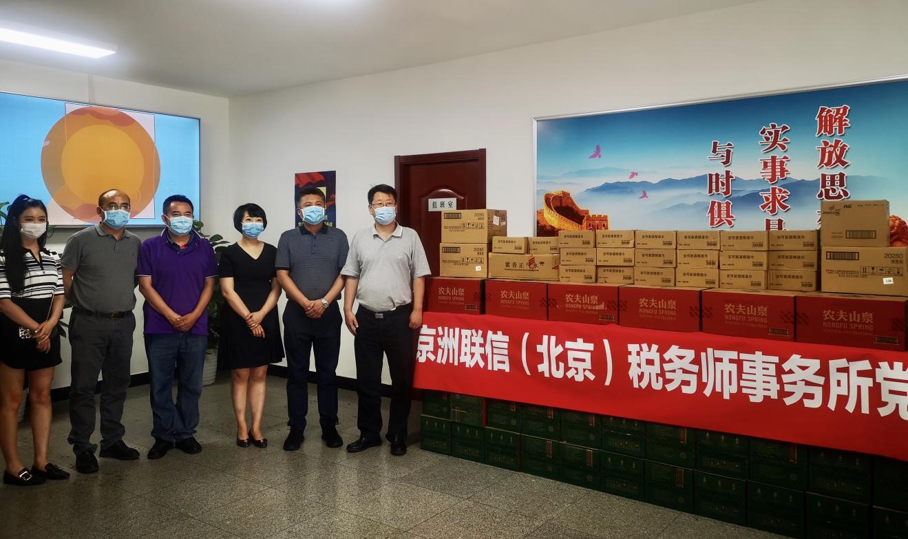 7月1日,正值建黨99周年之際,京洲聯(lián)信(北京)稅務(wù)師事務(wù)所黨支部書記洪希娜一行前往北京市西城區(qū)人民政府展覽路街道辦事處,捐贈(zèng)防暑物資:礦泉水100箱、藿香正氣水100盒、風(fēng)油精100盒、消毒濕巾100盒、花露水100瓶,為抗擊新型冠狀病毒肺炎疫情獻(xiàn)出事務(wù)所黨支部的一份力量。