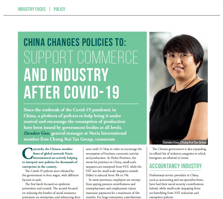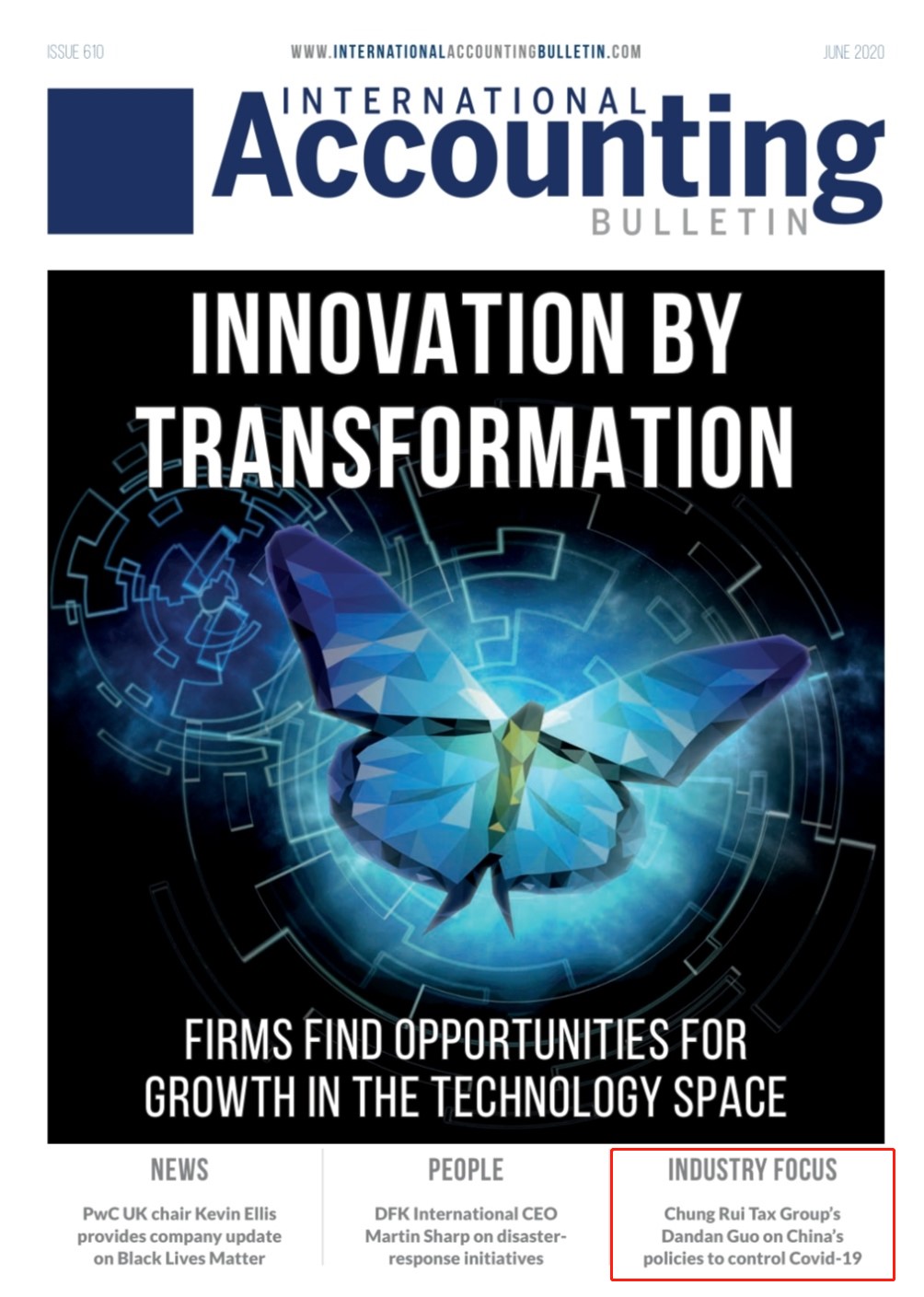 2020年6月,中瑞稅務(wù)集團總經(jīng)理郭丹丹女士發(fā)表的《中國疫情以來相關(guān)政策及對行業(yè)的影響》刊登于IAB《國際會計導(dǎo)報》雜志六月刊,IAB是全球會計界的最權(quán)威刊物,也是目前唯一可以發(fā)布全球國際會計公司和網(wǎng)絡(luò)排名的機構(gòu),文章被作為三大推送熱點之一發(fā)送給了所有訂閱的賬戶。