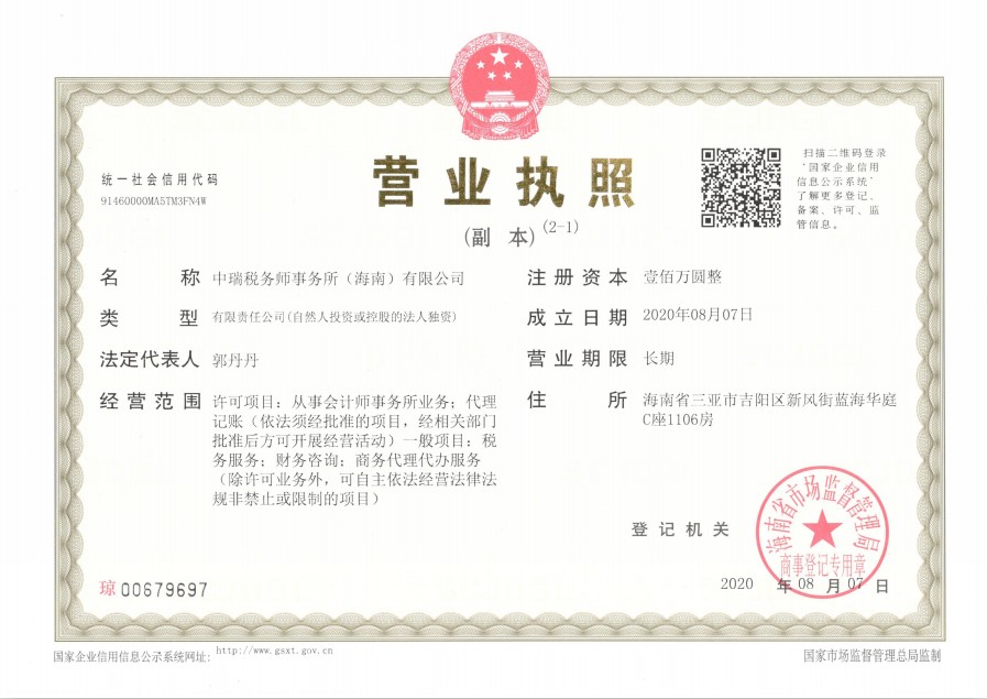 2020年8月7日,中瑞稅務(wù)師事務(wù)所(海南)有限公司正式取得營(yíng)業(yè)執(zhí)照,中瑞稅務(wù)集團(tuán)的第50家分支機(jī)構(gòu)落地海南。